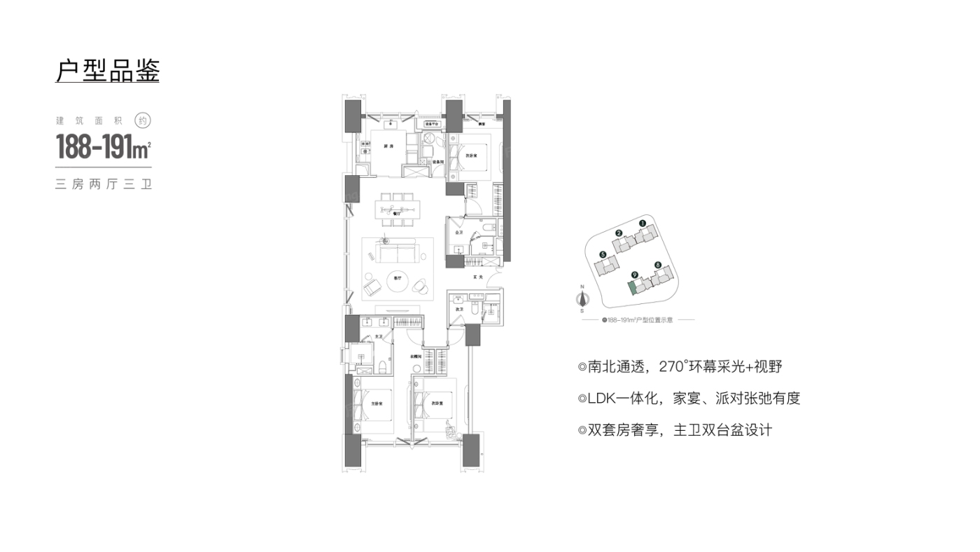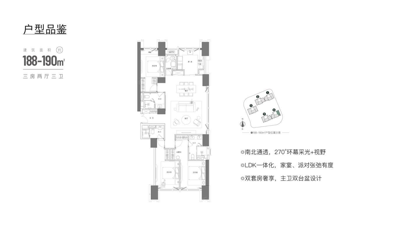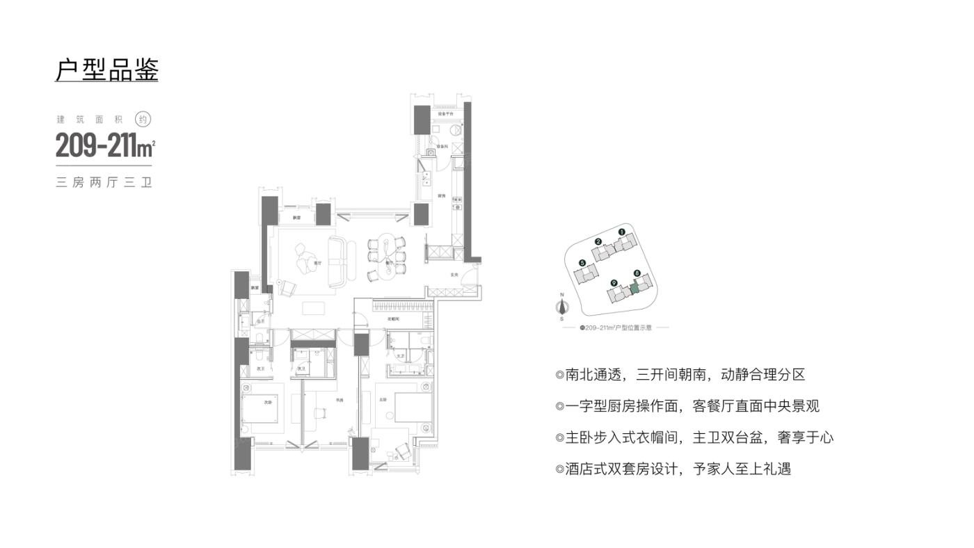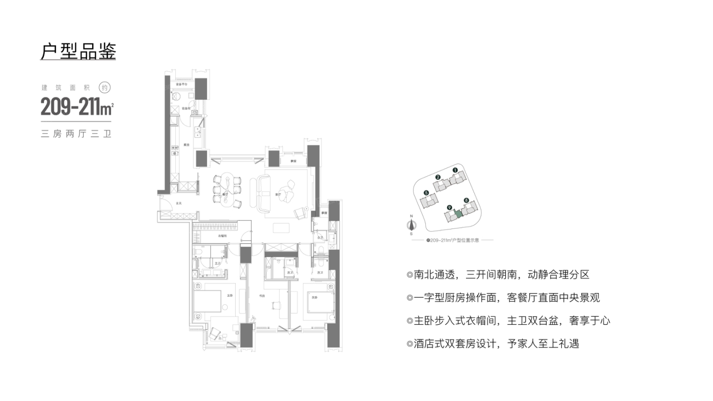 这个盘主打的户型在188到209平之间,都是三室两厅一卫的设计,面积跨度不大,适合对空间有要求但不需要太多房间的买家。容积率和绿化率控制得还不错,住起来不会太挤,环境也过得去。周边该有的配套基本都有,生活便利性没问题。