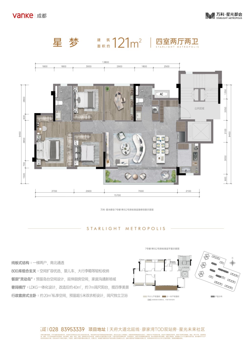 在直线3公里范围内,项目周边设有4个地铁站(包括廖家湾、柏水场、华桂路和北部商贸城),交通网络发达,最近的地铁站为廖家湾站。此外,直线1公里范围内有15个公交站点,最近的公交站距离项目仅208米,公共交通极为便利。